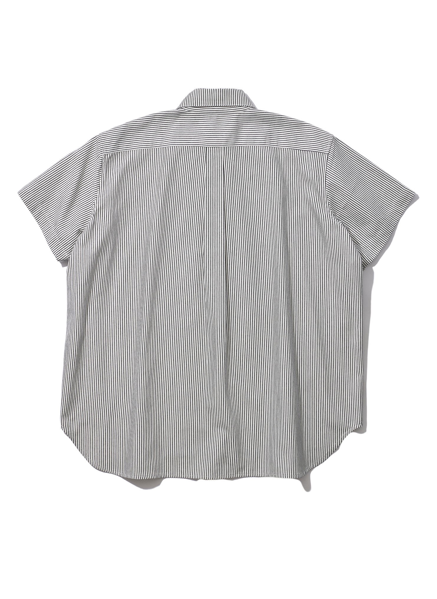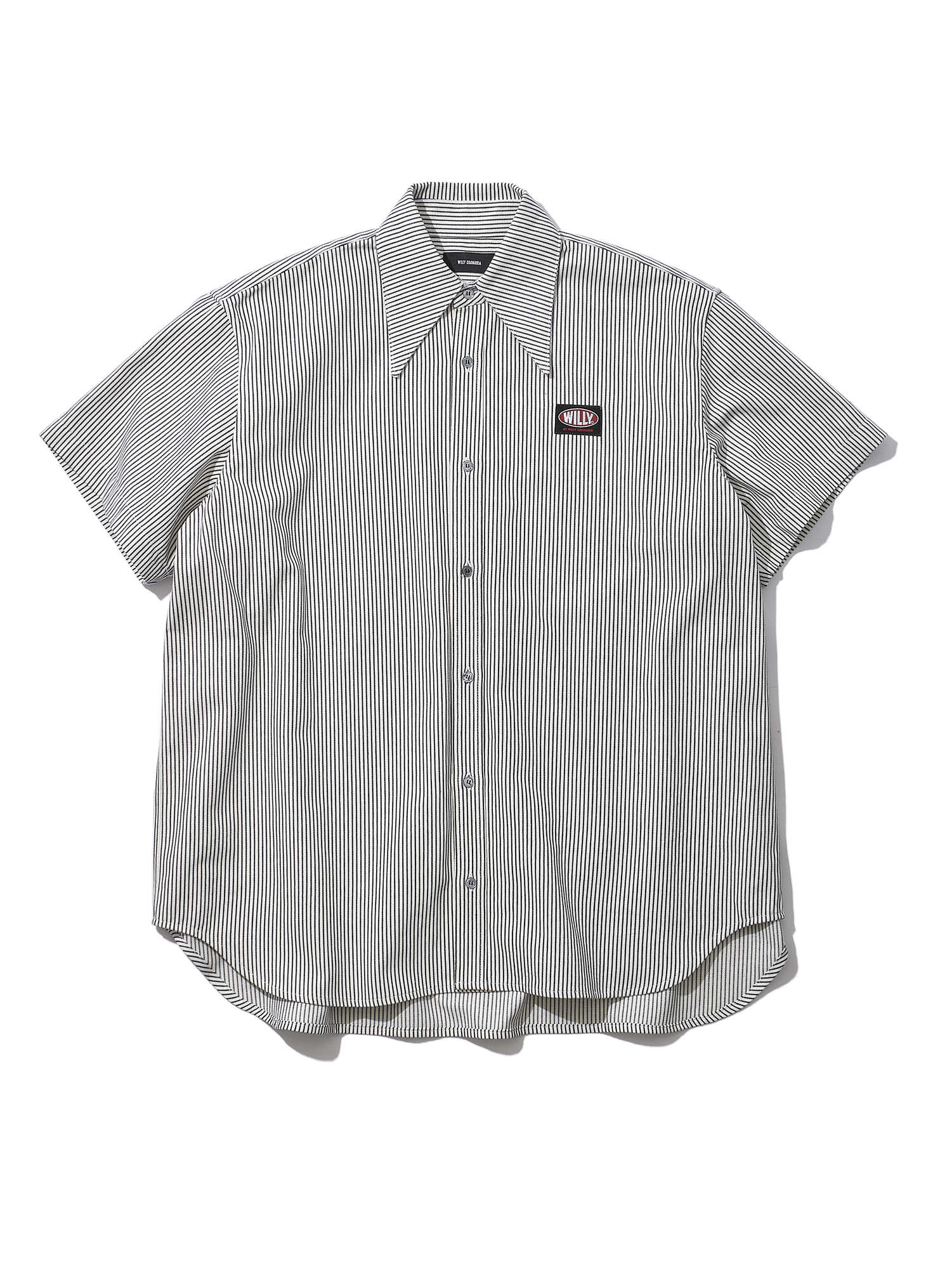 ストライプ柄にブランドパッチがアクセントのショートスリーブシャツ。ワークシャツっぽいカジュアルさにシャープな襟が、洗練されたストリートな印象を与えてくれる。
