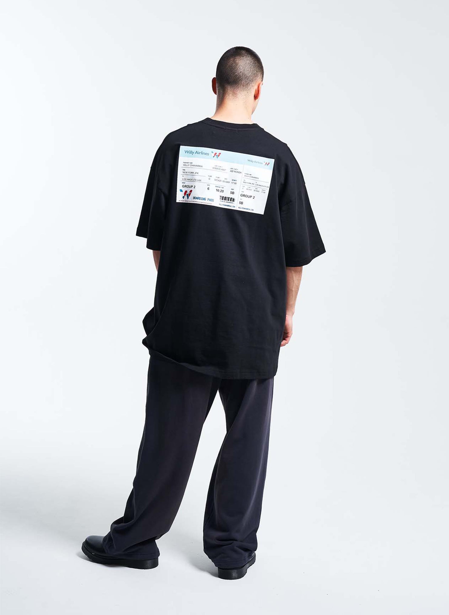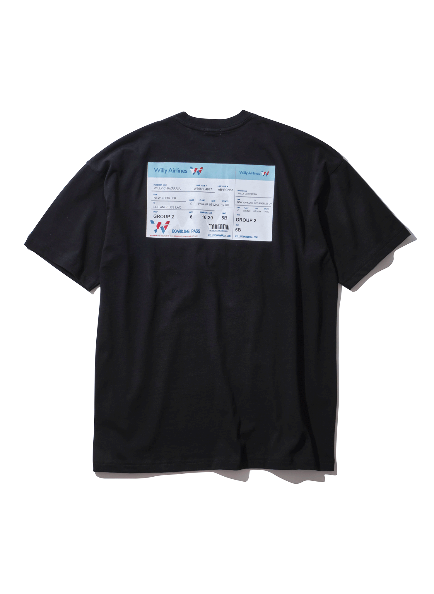 フロント、バックのボーディングパスが特徴的なプリントT。ペルビアンコットンの快適な着心地と、ワイドな身幅と程よい丈感のシグネチャーシルエット。