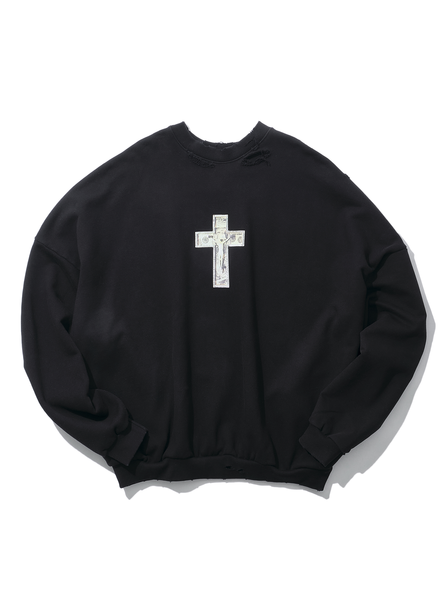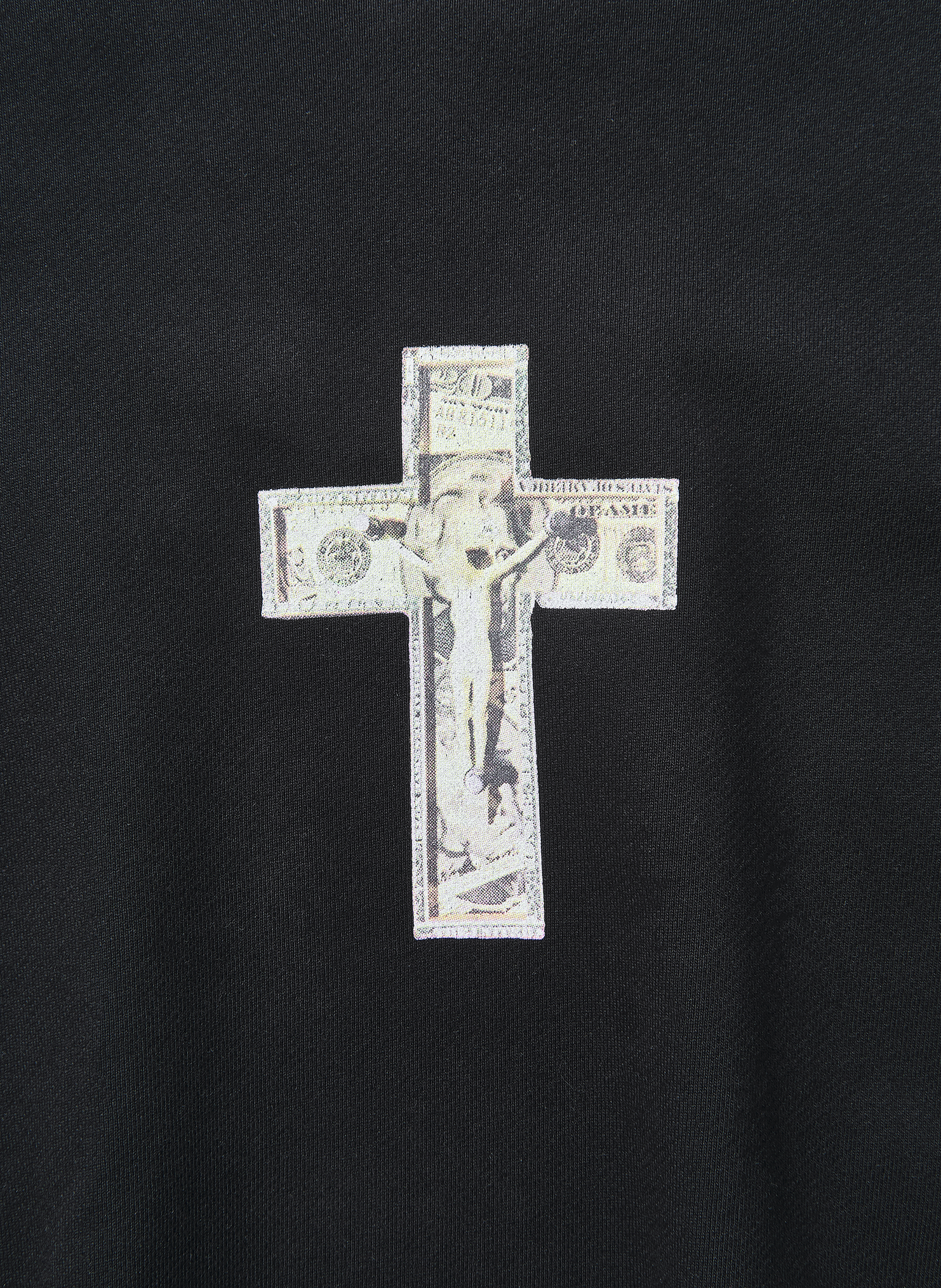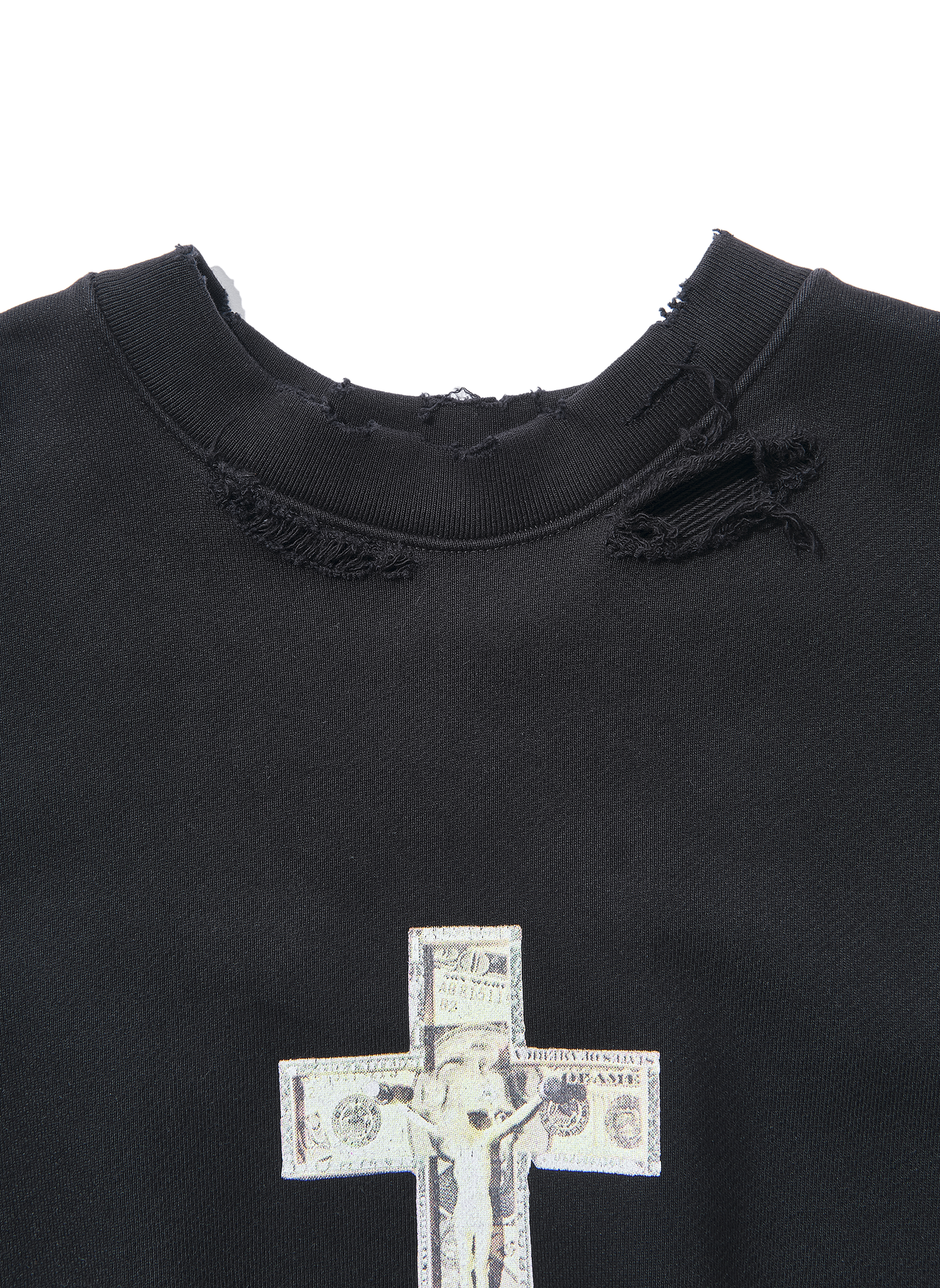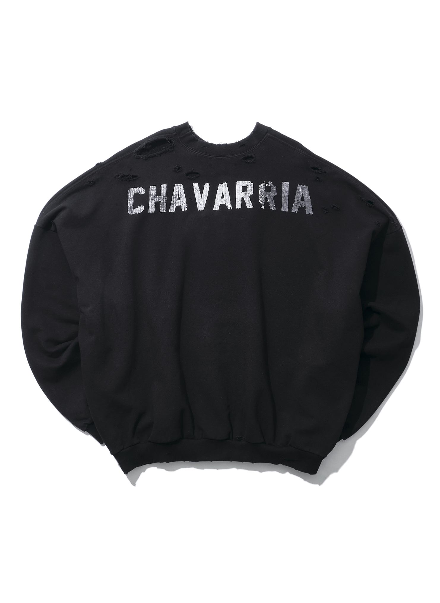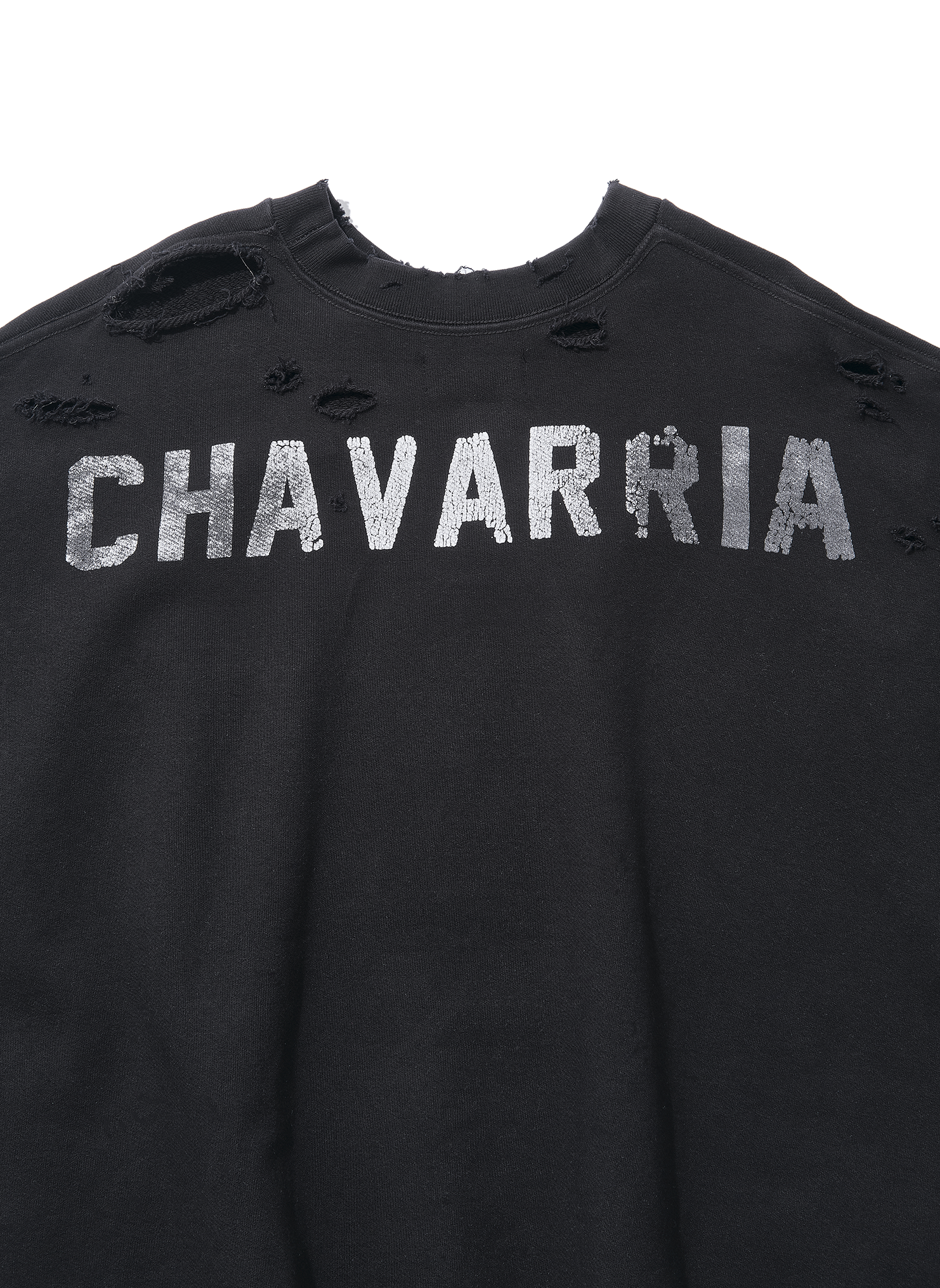 WILLY CHAVARRIAの定番でもある<HOOLIGAN CREW>にダメージ加工を施した。十字架のモチーフには女性とドル紙幣が描かれ、背中にはCHAVARRIAのプリント、もちろん手描きのタグが付いたショーピース商品。
