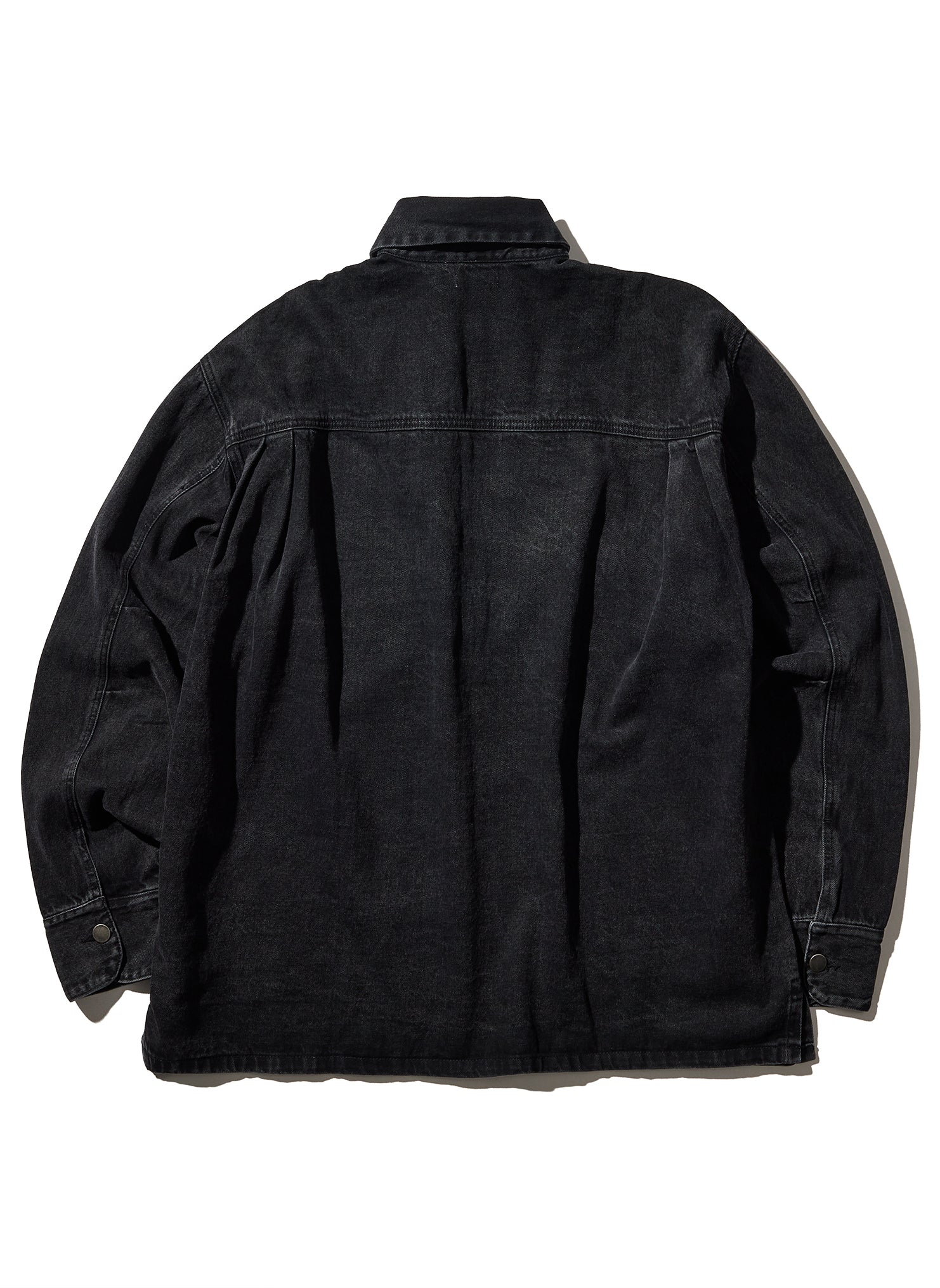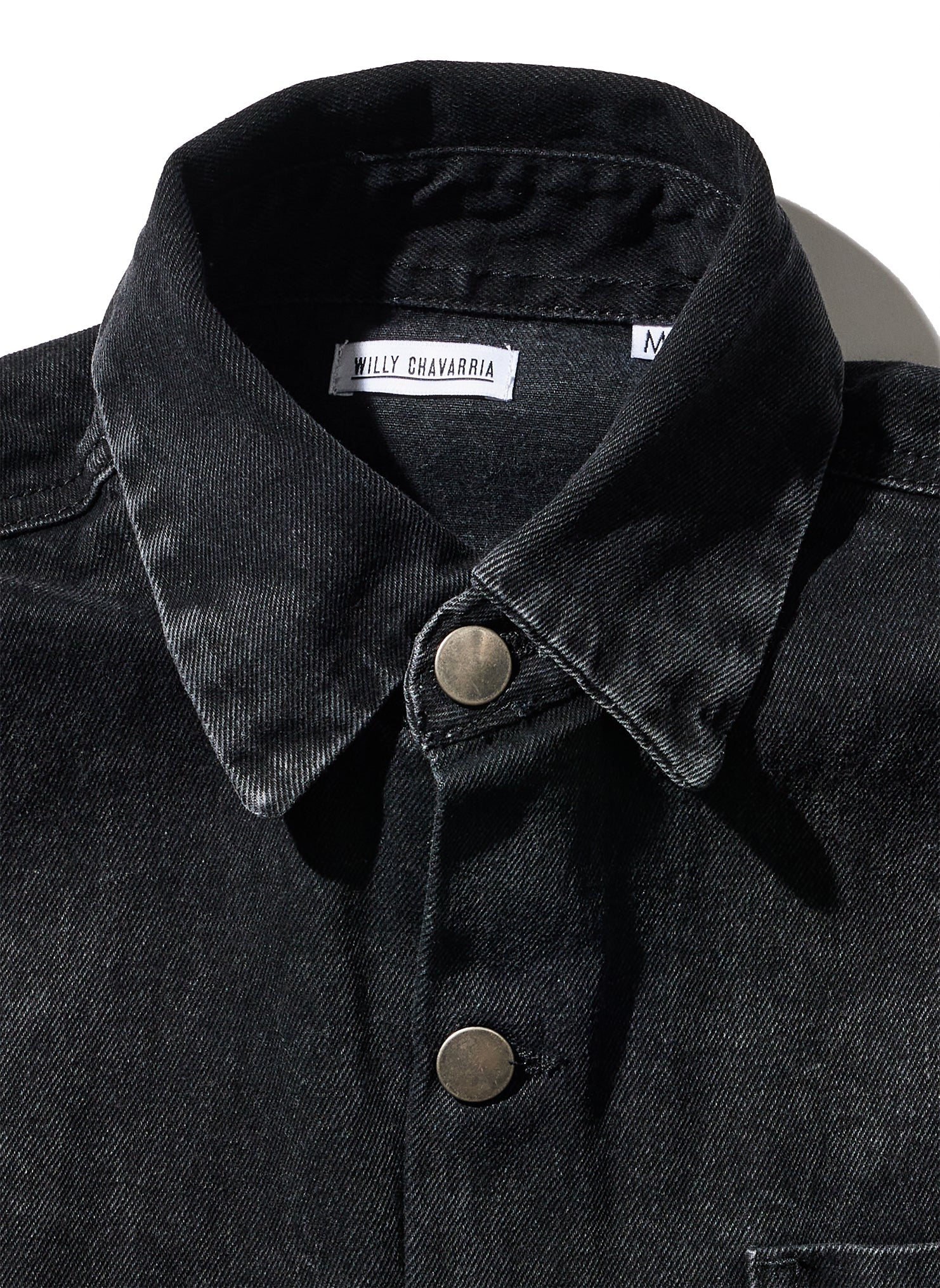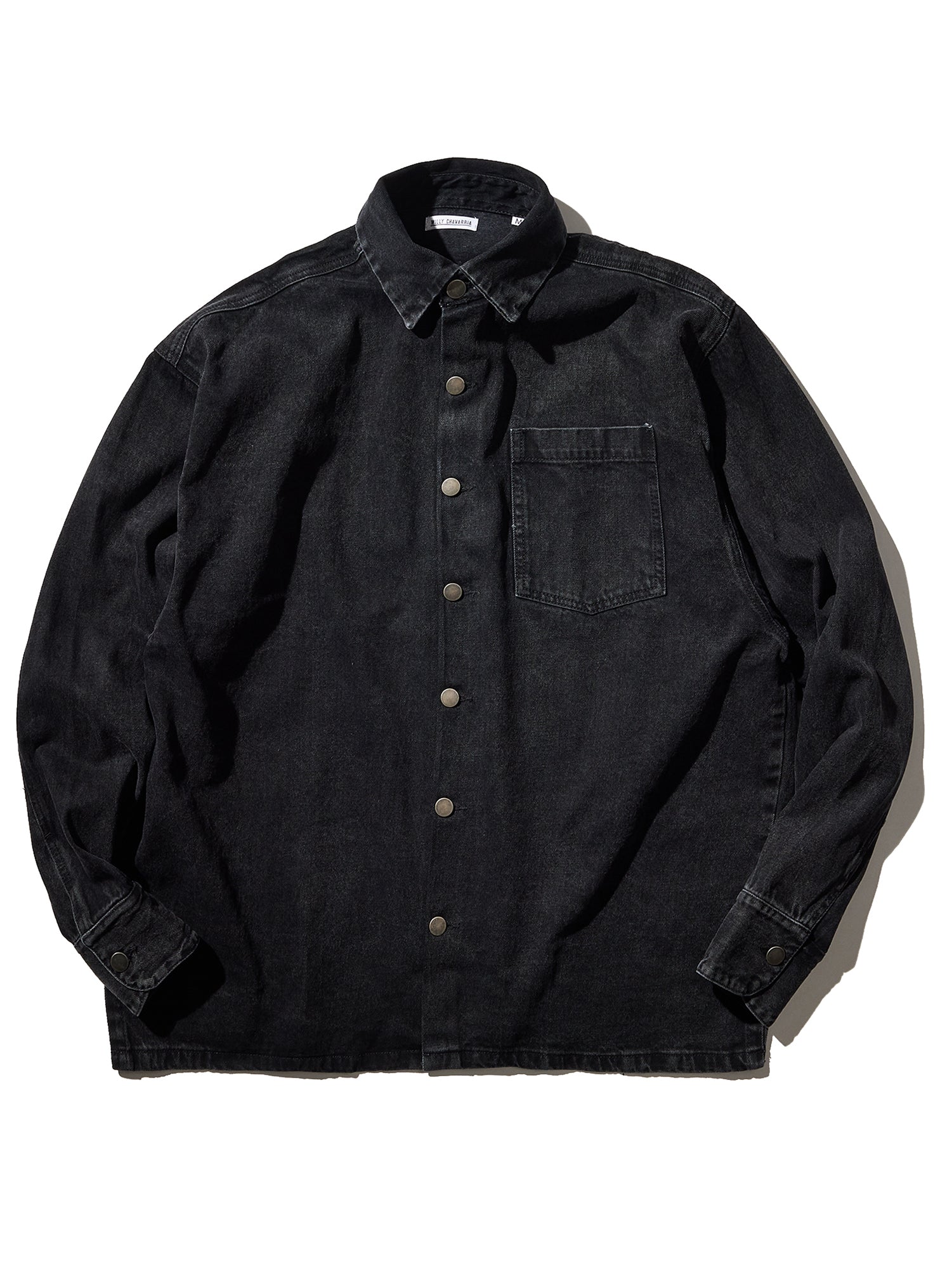 ソリッドブラックと洗いのかかったブラックの2色展開。オリジナルのタックボタンがデザインアクセントになった至高のデニムシャツ。