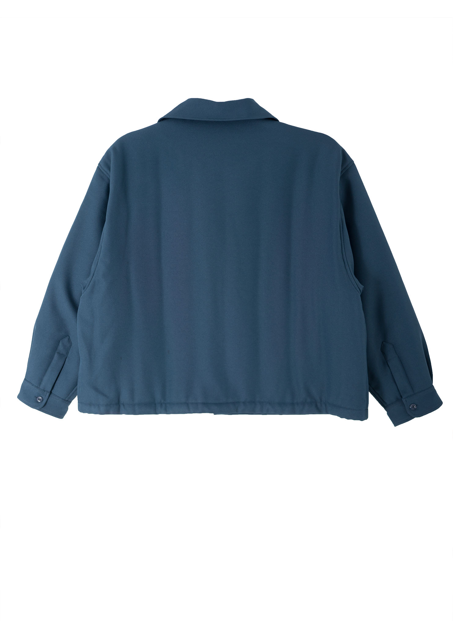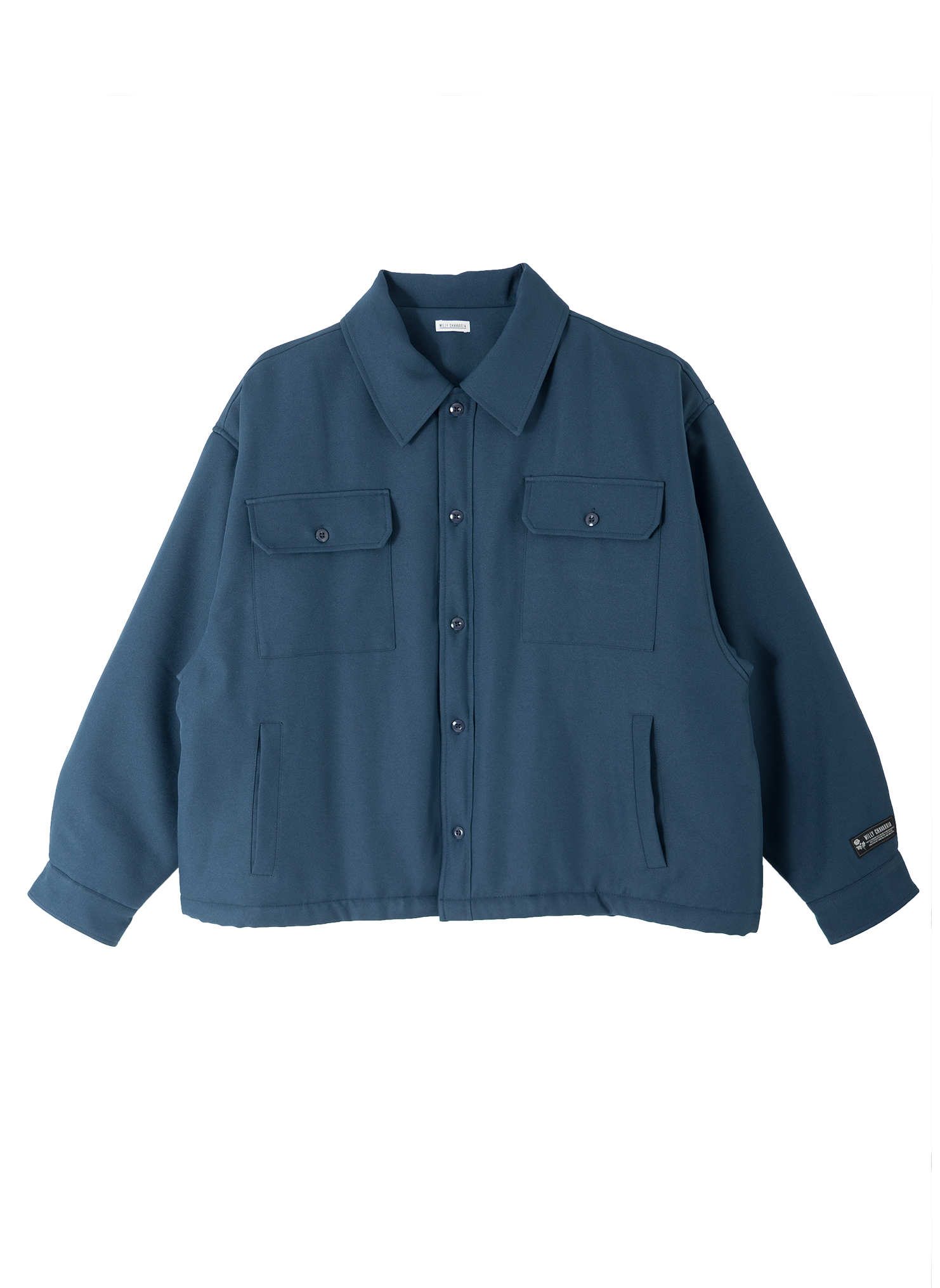 インナーにキルティング加工が施されたシャツジャケット。サラっとした質感と光沢感が特徴で快適な着心地をもたらしてくれる。ワークな印象を保ちつつもドレープ感のある独特なカッティング、広くとられた肩幅と着丈の短いシルエットは健在。